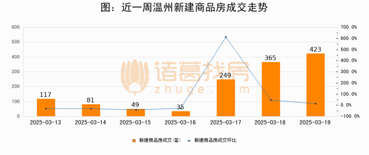 根据温州市住房和城乡建设局数据显示,2025年03月19日温州新建商品房成交423套,较昨日增加58套,环比上涨15.9%。近一周温州新建商品房日均成交189套。03月19日单日成交423套,高于近一周平均水平123.8%。