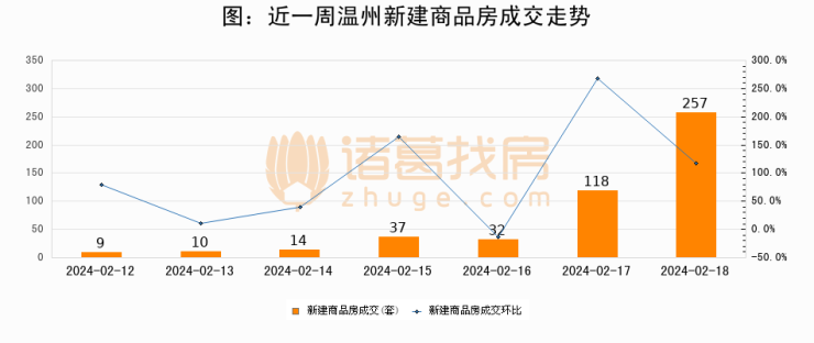 根据温州市住房和城乡建设局数据显示,2024年02月18日温州新建商品房成交257套,较昨日增加139套,环比上涨117.8%