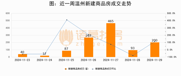 根据温州市住房和城乡建设局数据显示,2024年11月29日温州新建商品房成交200套,较昨日增加107套,环比上涨115.1%