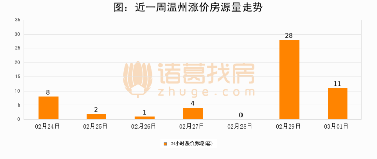 根据诸葛找房数据显示,温州24小时涨价房源量为11套,较02月29日减少17套,环比下降60.7%。与此同时,涨价房源占比小幅回落,对于购房者来说是一个入市窗口期,购房者可抓住时机入市。