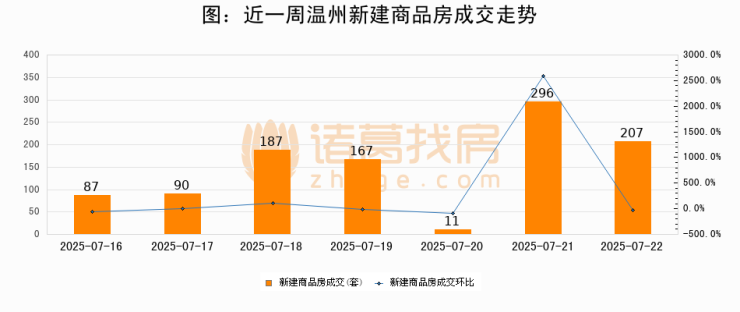 根据温州市住房和城乡建设局数据显示,2025年07月22日温州新建商品房成交207套,较昨日减少89套,环比下降30.1%