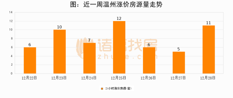 根据诸葛找房数据显示,温州24小时涨价房源量为11套,较12月27日增加6套,环比上涨120%。与此同时,涨价房源占比小幅扩大,业主信心有所提升。