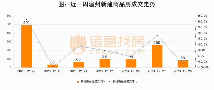根据温州市住房和城乡建设局数据显示,2023年12月28日温州新建商品房成交83套,较昨日减少177套,环比下降68.1%