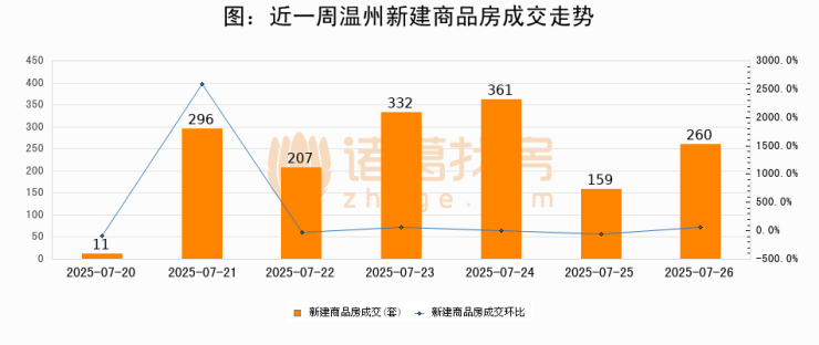 根据温州市住房和城乡建设局数据显示,2025年07月26日温州新建商品房成交260套,较昨日增加101套,环比上涨63.5%