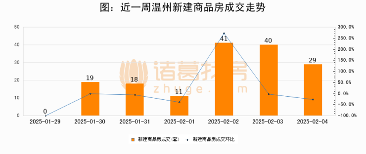 根据温州市住房和城乡建设局数据显示,2025年02月04日温州新建商品房成交29套,较昨日减少11套,环比下降27.5%。近一周温州新建商品房日均成交23套。02月04日单日成交29套,高于近一周平均水平26.1%。