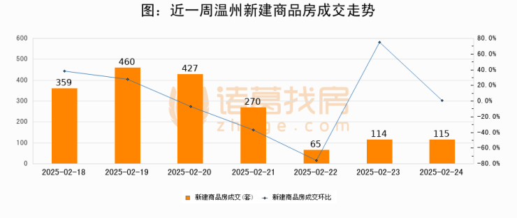 根据温州市住房和城乡建设局数据显示,2025年02月24日温州新建商品房成交115套,较昨日增加1套,环比上涨0.9%