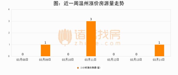 根据诸葛找房数据显示,温州24小时涨价房源量为1套,较03月13日增加1套,环比上涨0%。与此同时,涨价房源占比小幅扩大,业主信心有所提升。