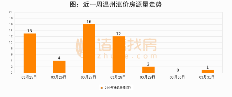 根据诸葛找房数据显示,温州24小时涨价房源量为1套,较03月30日增加1套,环比上涨0%。与此同时,涨价房源占比小幅扩大,业主信心有所提升。