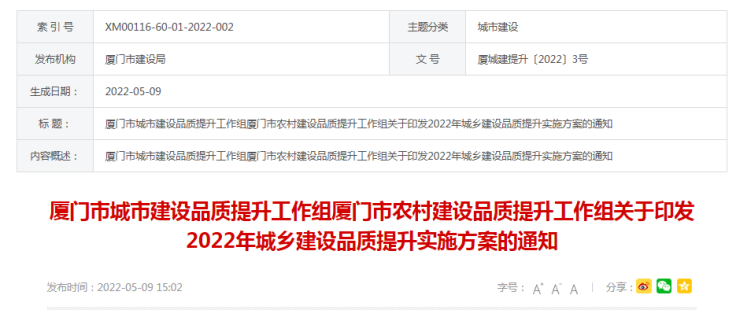2022年5月9日,厦门市建设局官网发布《2022年城乡建设品质提升实施方案的通知》。该《通知》将“城市更新工程”列为重点任务之一,包括提升城市宜居水平、打造城市风貌特色、历史文化保护利用、城市照明整治等9个方面。