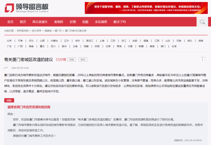 澎湃新闻(www.thepaper.cn)注意到,5月初,有网友在人民网“领导留言板”向厦门市委书记崔永辉留言称,厦门目前已成为城市更新改造试点城市,根据住建部的部署,20年以上房龄的危旧房是城市更新重点。厦门的危旧房较多,最大规模城市棚户区是位于思明东路及思明西路以北,故宫路以西,厦禾路以南,鹭江道以东区域,房龄基本在30年及以上。