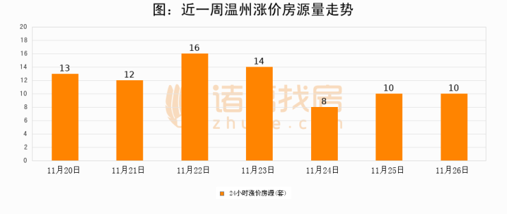 根据诸葛找房数据显示,温州24小时涨价房源量为10套,较11月25日持平。