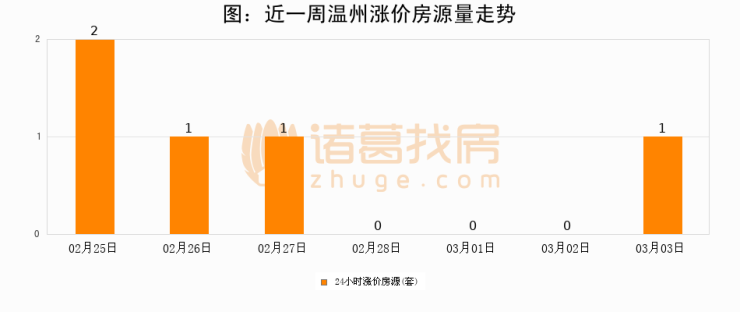 根据诸葛找房数据显示,温州24小时涨价房源量为1套,较03月02日增加1套,环比上涨0%。与此同时,涨价房源占比小幅扩大,业主信心有所提升。