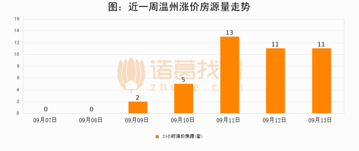 根据诸葛找房数据显示,温州24小时涨价房源量为11套,较09月12日持平。
