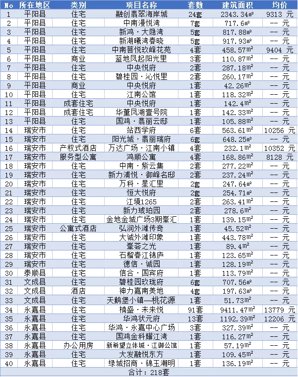 永嘉、泰顺、瑞安、平阳、文成6月29日新房成交