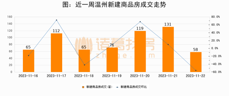 根据温州市住房和城乡建设局数据显示,2023年11月22日温州新建商品房成交58套,较昨日减少73套,环比下降55.7%