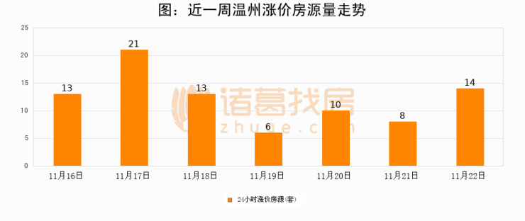 根据诸葛找房数据显示,温州24小时涨价房源量为14套,较11月21日增加6套,环比上涨75%。与此同时,涨价房源占比小幅扩大,业主信心有所提升。