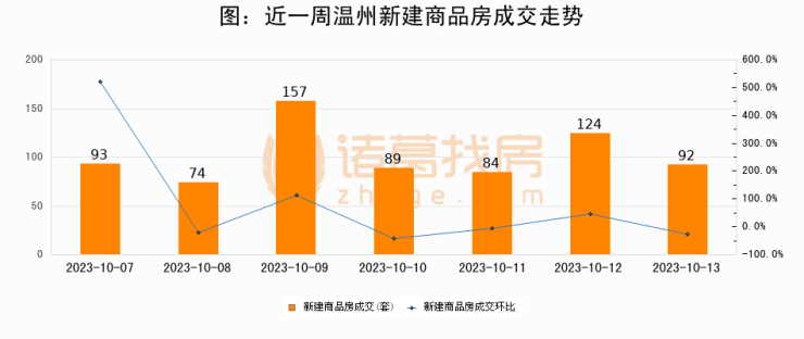 根据温州市住房和城乡建设局数据显示,2023年10月13日温州新建商品房成交92套,较昨日减少32套,环比下降25.8%