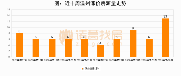 从调价房源来看,第26周温州涨价房源13套,较上周上涨116.7%。与此同时,26周涨价房源占比提升8.04个百分点,业主信心持续恢复。