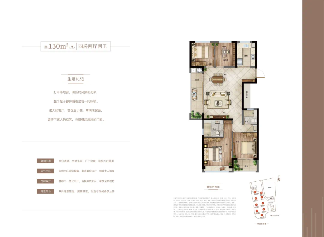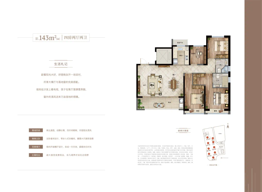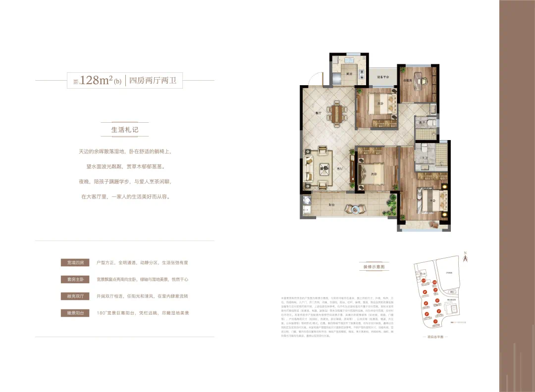 约128㎡四房设计,近29㎡大尺度餐客连厅、近7米大开间跑道式阳台,大大提升了入门级改善的档次。