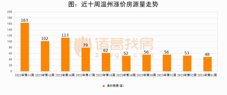 从调价房源来看,第52周温州涨价房源48套,较上周下降9.4%。与此同时,52周涨价房源占比提升0.88个百分点,业主信心持续恢复。