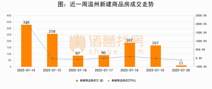根据温州市住房和城乡建设局数据显示,2025年07月20日温州新建商品房成交11套,较昨日减少156套,环比下降93.4%