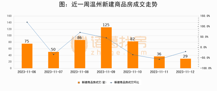 根据温州市住房和城乡建设局数据显示,2023年11月12日温州新建商品房成交29套,较昨日减少7套,环比下降19.4%