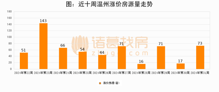 从调价房源来看,第31周温州涨价房源73套,较上周上涨329.4%。与此同时,31周涨价房源占比提升0.76个百分点,业主信心持续恢复。