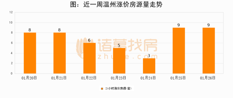 根据诸葛找房数据显示,温州24小时涨价房源量为9套,较01月25日持平。