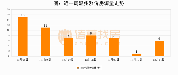 根据诸葛找房数据显示,温州24小时涨价房源量为6套,较12月10日增加5套,环比上涨500%。与此同时,涨价房源占比小幅扩大,业主信心有所提升。