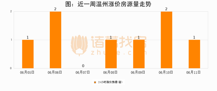 根据诸葛找房数据显示,温州24小时涨价房源量为1套,较06月10日减少1套,环比下降50%。与此同时,涨价房源占比小幅回落,对于购房者来说是一个入市窗口期,购房者可抓住时机入市。