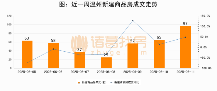 根据温州市住房和城乡建设局数据显示,2025年06月11日温州新建商品房成交97套,较昨日增加32套,环比上涨49.2%