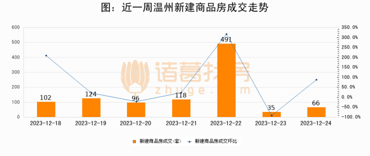 根据温州市住房和城乡建设局数据显示,2023年12月24日温州新建商品房成交66套,较昨日增加31套,环比上涨88.6%