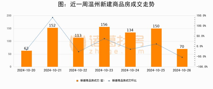根据温州市住房和城乡建设局数据显示,2024年10月26日温州新建商品房成交70套,较昨日减少80套,环比下降53.3%