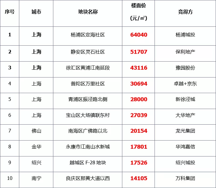 ▌宅地单价TOP10:榜单均价环比增近两成,上海杨浦区宅地居首