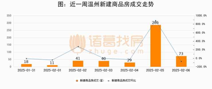 根据温州市住房和城乡建设局数据显示,2025年02月06日温州新建商品房成交73套,较昨日减少213套,环比下降74.5%