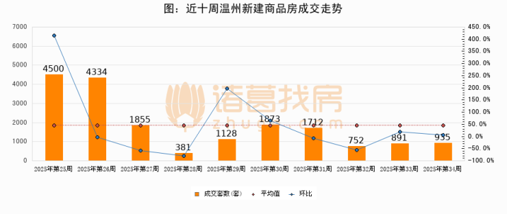 进入2025年第34周(08月18日-08月24日),温州新建商品房成交935套,较上周增加44套,环比上涨4.9%