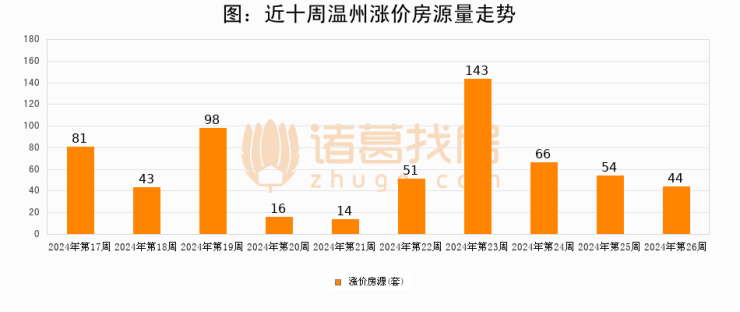 从调价房源来看,第26周温州涨价房源44套,较上周下降18.5%。与此同时,26周涨价房源占比提升0.98个百分点,业主信心持续恢复。