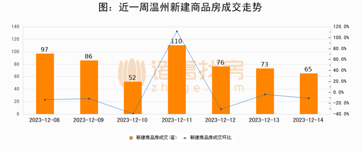 根据温州市住房和城乡建设局数据显示,2023年12月14日温州新建商品房成交65套,较昨日减少8套,环比下降11%