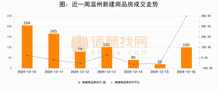根据温州市住房和城乡建设局数据显示,2024年12月16日温州新建商品房成交100套,较昨日增加80套,环比上涨400%