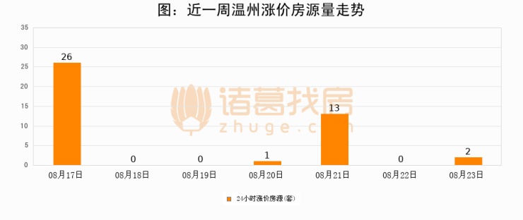 根据诸葛找房数据显示,温州24小时涨价房源量为2套,较08月22日增加2套,环比上涨0%。与此同时,涨价房源占比小幅扩大,业主信心有所提升。