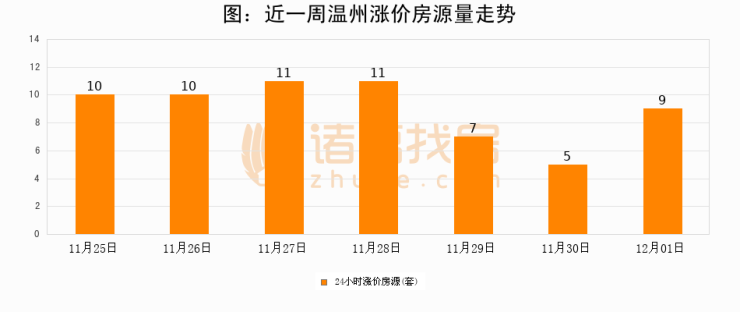 根据诸葛找房数据显示,温州24小时涨价房源量为9套,较11月30日增加4套,环比上涨80%。与此同时,涨价房源占比小幅扩大,业主信心有所提升。