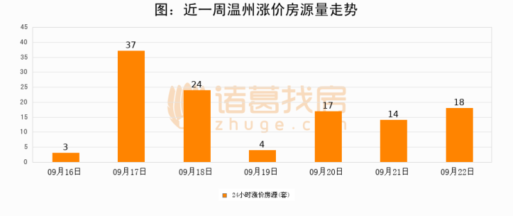 根据诸葛找房数据显示,温州24小时涨价房源量为18套,较09月21日增加4套,环比上涨28.6%。与此同时,涨价房源占比小幅扩大,业主信心有所提升。