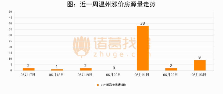 根据诸葛找房数据显示,温州24小时涨价房源量为9套,较06月22日增加7套,环比上涨350%。与此同时,涨价房源占比小幅扩大,业主信心有所提升。
