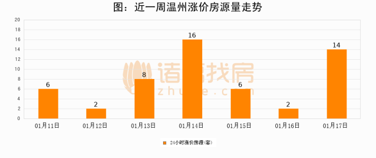 根据诸葛找房数据显示,温州24小时涨价房源量为14套,较01月16日增加12套,环比上涨600%。与此同时,涨价房源占比小幅扩大,业主信心有所提升。
