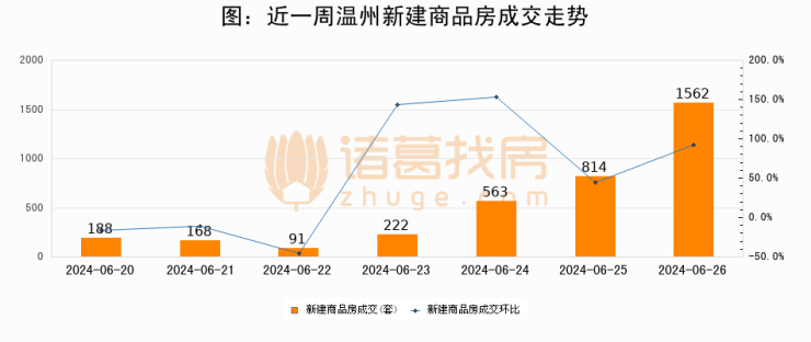 根据温州市住房和城乡建设局数据显示,2024年06月26日温州新建商品房成交1562套,较昨日增加748套,环比上涨91.9%。近一周温州新建商品房日均成交516套。06月26日单日成交1562套,高于近一周平均水平202.7%。