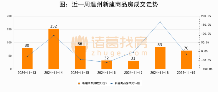 根据温州市住房和城乡建设局数据显示,2024年11月19日温州新建商品房成交70套,较昨日减少13套,环比下降15.7%