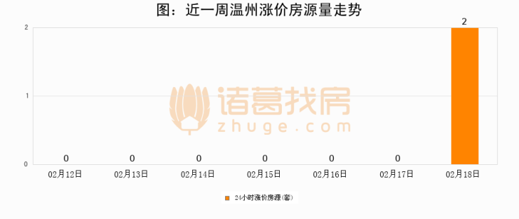根据诸葛找房数据显示,温州24小时涨价房源量为2套,较02月17日增加2套,环比上涨0%。与此同时,涨价房源占比小幅扩大,业主信心有所提升。