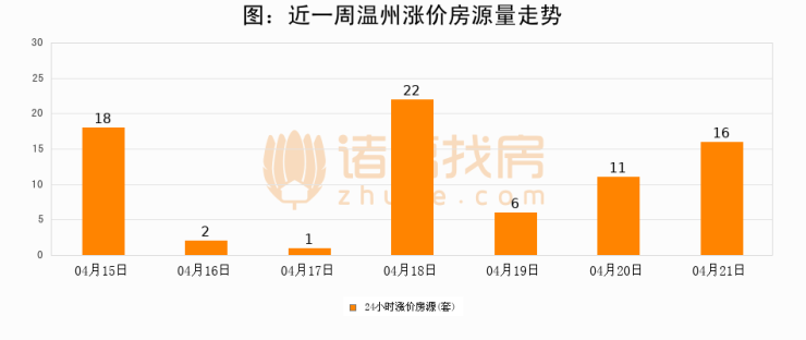 根据诸葛找房数据显示,温州24小时涨价房源量为16套,较04月20日增加5套,环比上涨45.5%。与此同时,涨价房源占比小幅扩大,业主信心有所提升。