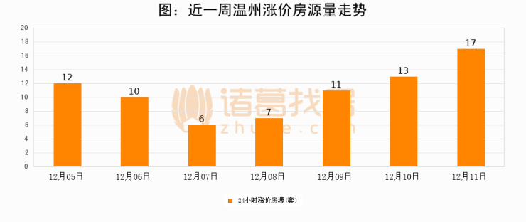 根据诸葛找房数据显示,温州24小时涨价房源量为17套,较12月10日增加4套,环比上涨30.8%。与此同时,涨价房源占比小幅扩大,业主信心有所提升。