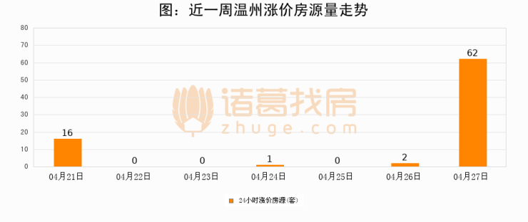 根据诸葛找房数据显示,温州24小时涨价房源量为62套,较04月26日增加60套,环比上涨3000%。与此同时,涨价房源占比小幅扩大,业主信心有所提升。